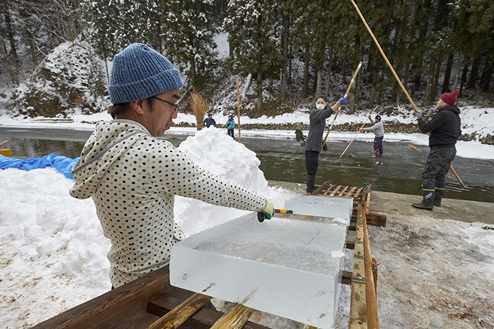 전기 얼음 절단기를 움직여 얼음 표면에 그려진 수직선과 수평선에 따라 절단합니다. 그런 다음 당긴 얼음을 대나무 레일 위에 놓고 사람의 힘으로 미끄러져 운반합니다. 끝이 열쇠 모양의 "토비구치"라는 도구로 얼음을 모으면서 유동 과정으로 얼음 방(히무로)에 배치합니다. 얼음 한 조각의 무게는 약 40kg이며, 블록 얼음 10~12개(1번째 조각, 약 3.75kg)를 가져갈 수 있습니다. 연간 생산량은 약 5,500개(220톤)입니다.